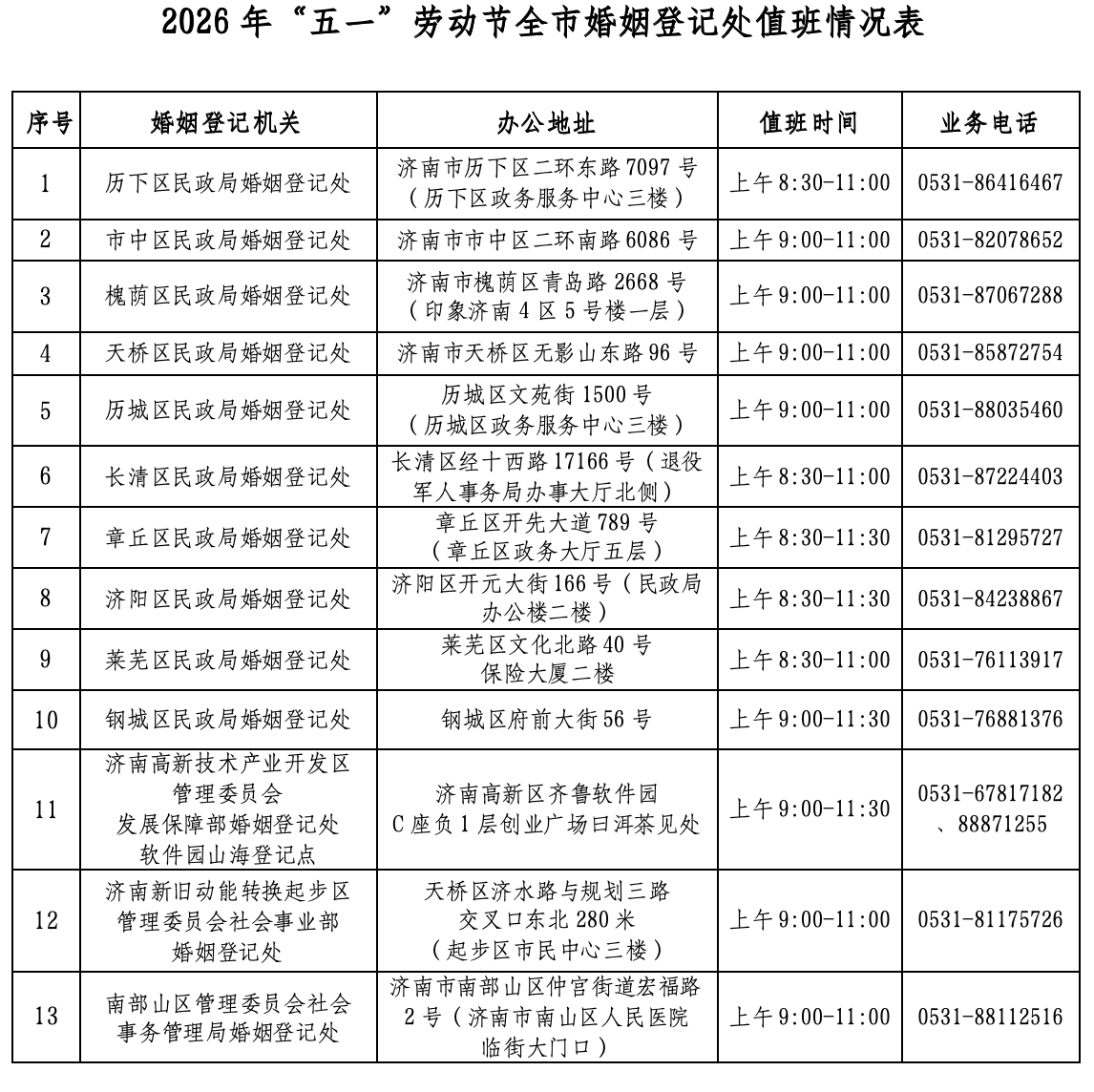 为进一步优化婚姻登记服务,满足群众多样化、个性化办事需求,不断提升便民服务质效,全市13家婚姻登记处2026年5月1日当天开展结婚预约登记服务,现公告如下: