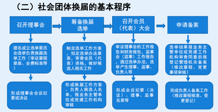 (三)规范成立及换届选举,以及变更登记的报批备案。一是明确社会团体成立及换届的审核及公示制度;二是明确社会团体章程核准,负责人、监事长备案和变更登记服务规范;三是明确社会团体延期换届事先报批程序。