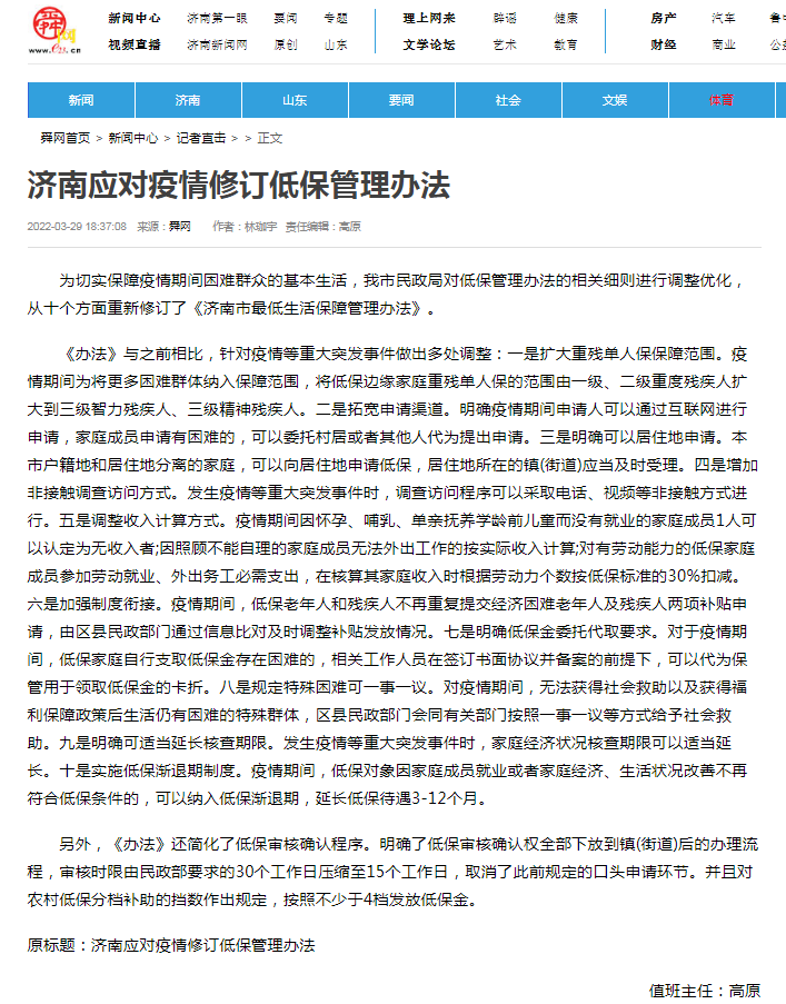 - 标题: 【媒体解读】济南应对疫情修订低保管理办法