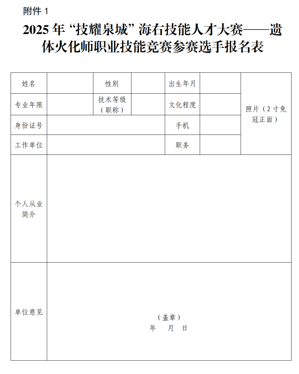 附件: 1. 2025 年“技耀泉城”海右技能人才大赛——遗体火化师职业技能竞赛参赛选手报名表