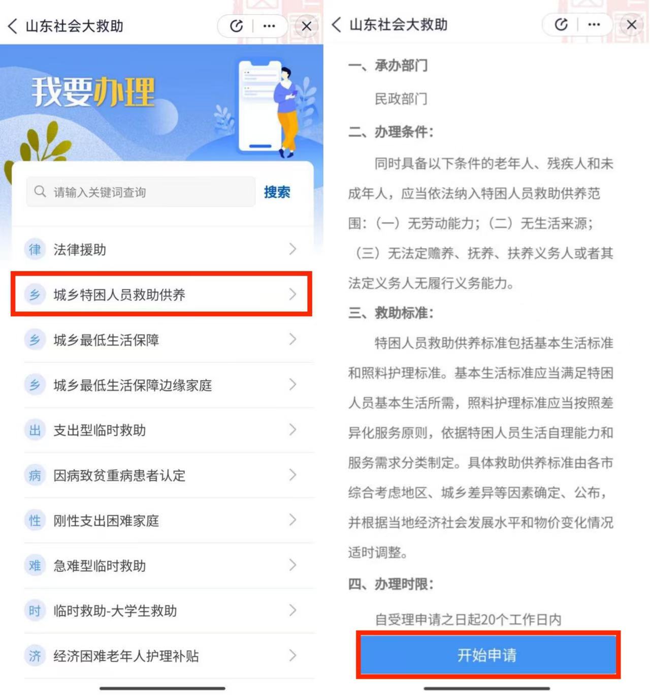 3.注册完成后,在列表中选择“城乡特困人员救助供养”,开始申请。