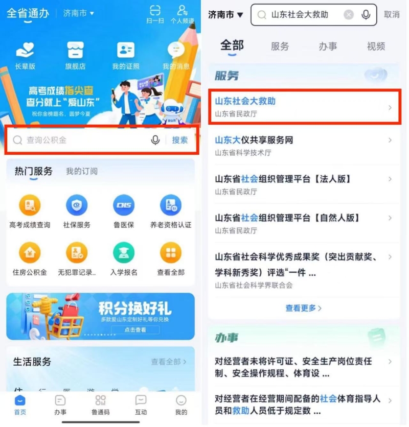 1.打开“爱山东”,在搜索框中搜索“山东社会大救助”,点击“山东社会大救助”。