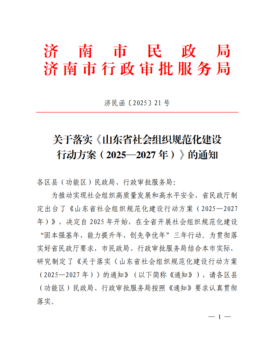 为贯彻落实山东省民政厅《山东省社会组织规范化建设行动方案(2025—2027年)》,推动全省社会组织开展“固本强基年、能力提升年、创先争优年”三年行动,市民政局、行政审批服务局结合本市实际,研究制定了《关于落实〈山东省社会组织规范化建设行动方案(2025—2027年)〉的通知》(以下简称《通知》)。