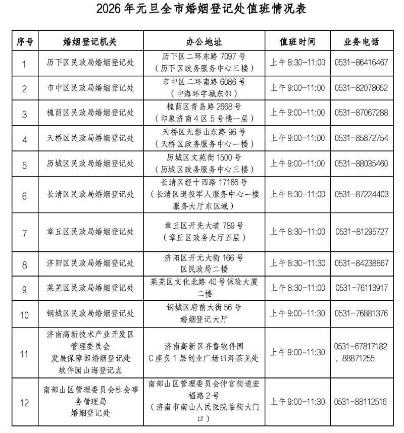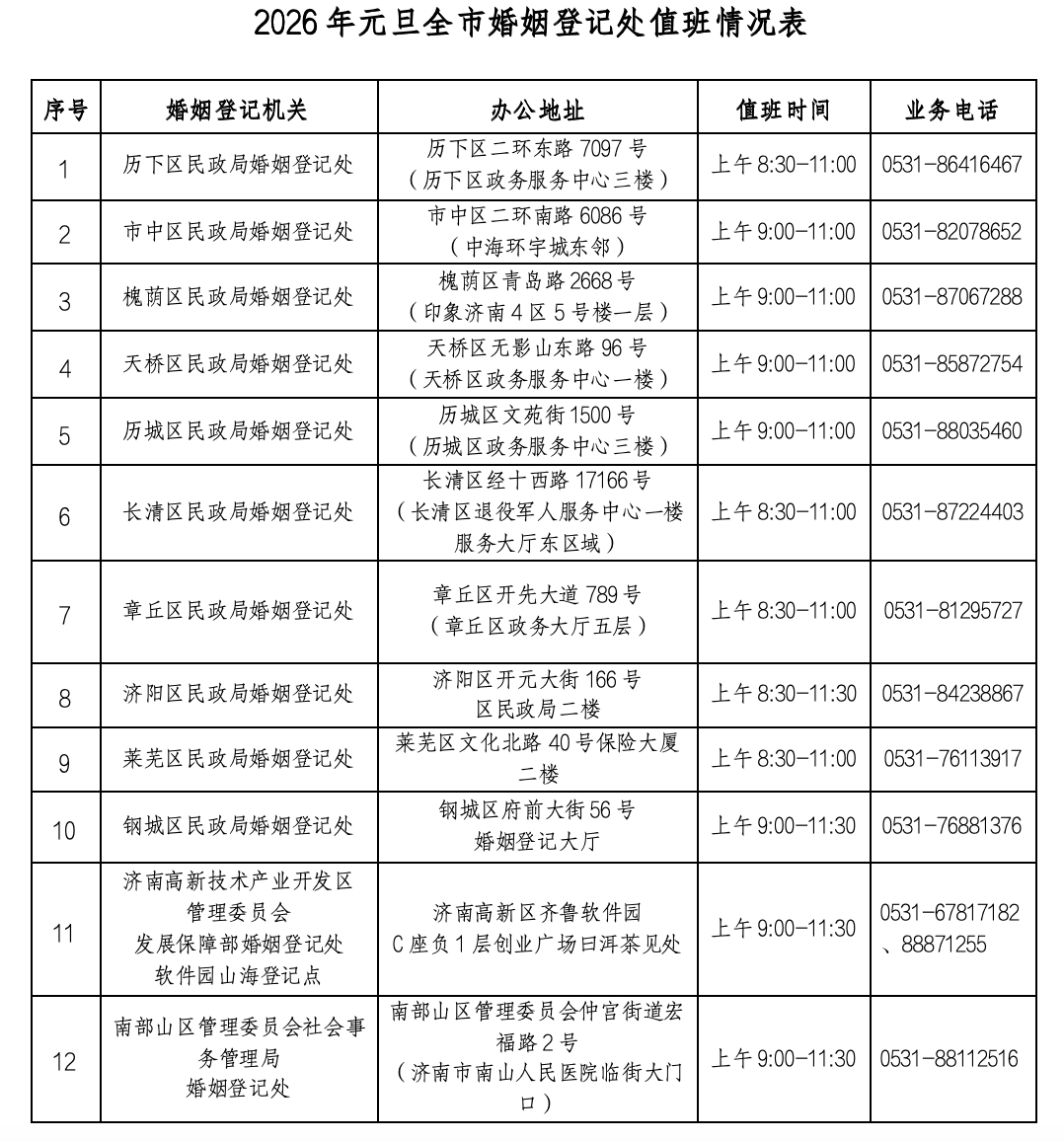 为进一步优化婚姻登记服务,满足群众多样化、个性化办事需求,不断提升便民服务质效,全市12家婚姻登记处2026年元旦当天开展结婚预约登记服务,现公告如下: