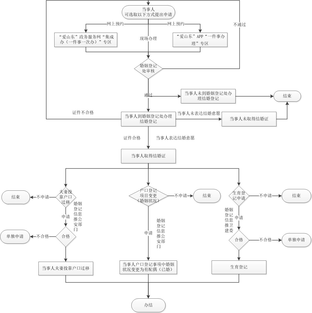 当事人可以通过登录“爱山东”APP平台“一件事办理”专区或“爱山东”政务服务网(网址:http://www.shandong.gov.cn/col/col94091/index.html)“集成办(一件事·一次办)”专区进入“婚育户”一件事主题集成服务模块进行结婚登记网上预约和户口登记项目变更(婚姻状况)、户口迁移(仅限夫妻投靠)、生育登记的申请。