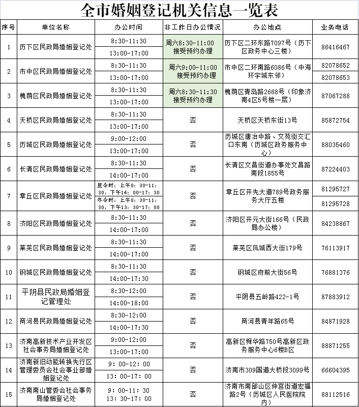 13 | 济南高新技术产业开发区社会事务局婚姻登记处 | 高新区舜华路750号高新区政务服务中心6楼B区 | 0531-88871255 |